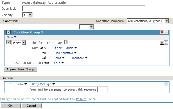 Some very simple policies can be created using a Deny action. For example, suppose you have an application that you only want managers to access. If you have set up a role that assigns all managers to the Manager role, you can use this characteristic for an Authorization policy. Such a rule would be similar to the following: