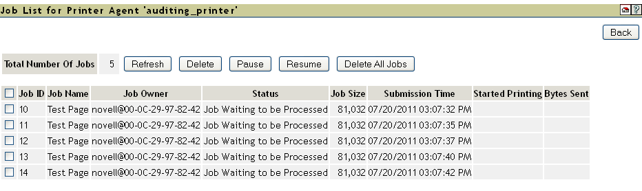Displays the current job list for this Printer Agent. This option is available only to administrators; the link appears only if you have manager or admin rights to the Printer Agent.
