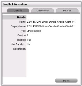 The Details tab in the Bundles Information panel displays the bundle’s details such as name, display name, type, version, and description.