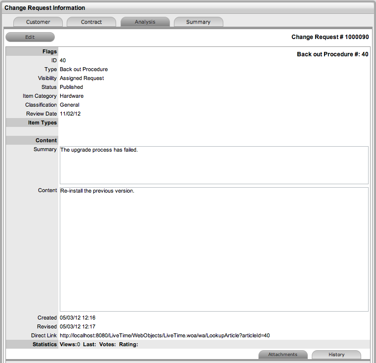 When the RFC has progressed through all of the required Workflow States, a change review is undertaken to verify that the RFC has achieved its objectives. If the change objectives are not met, the RFC’s associated back-out procedure is implemented to rollback the change and restore the CMDB to a valid state.