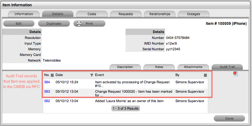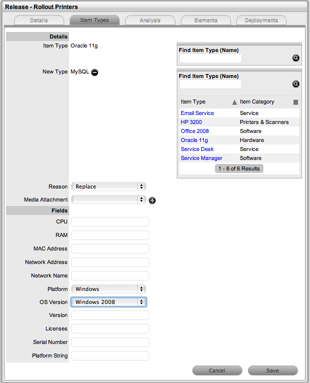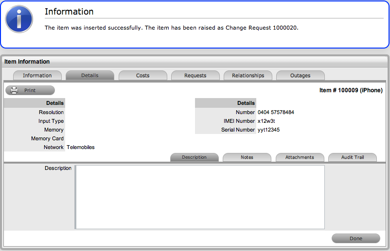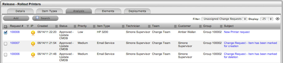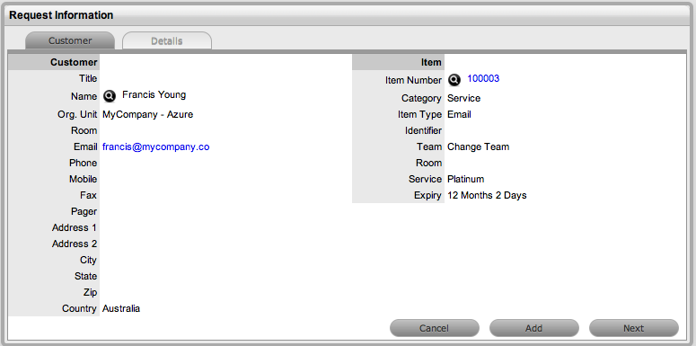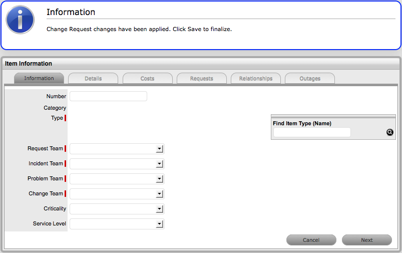 After the Customer details are assigned to the RFC, an Item or Items are associated with the Request. This assignment sets all the relationships of the Item(s), including service level agreements and Team assigned to support the RFC.