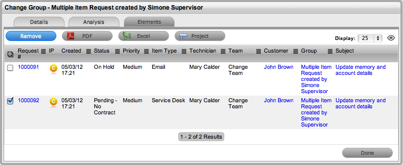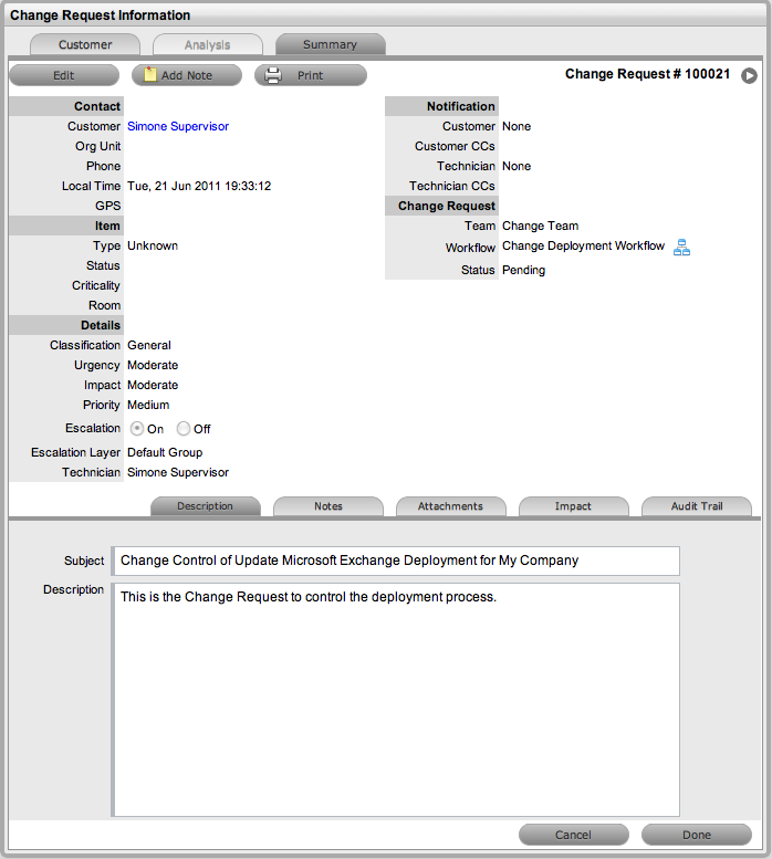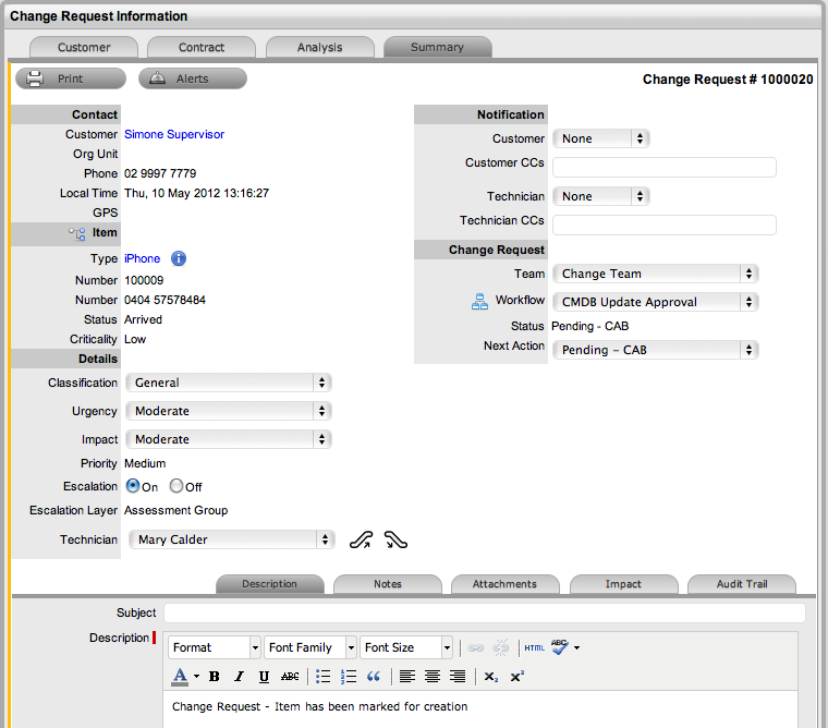 The Requests are managed as individual RFCs to cater for any special requirements relative to each Item. For example, consider a situation where a Team rolls-out an update in an organization. In this instance, during the Request creation process multiple Items are assigned to a single RFC, which the system automatically allocates to separate RFCs that are then managed on an individual basis. This allows appropriate Teams/ Technicians to be assigned to the RFCs relative to their skill-set or departmental assignments. The implementation process more effectively differentiates between the tasks and Items being modified and ensures each Item has its own Audit Trail, Attachments and Notes for future reference.