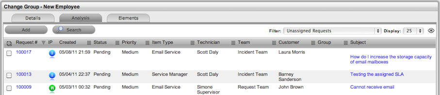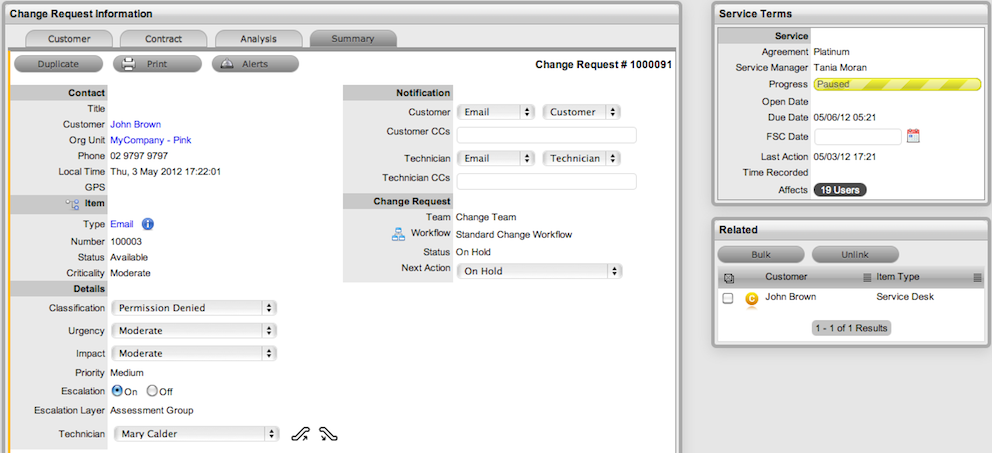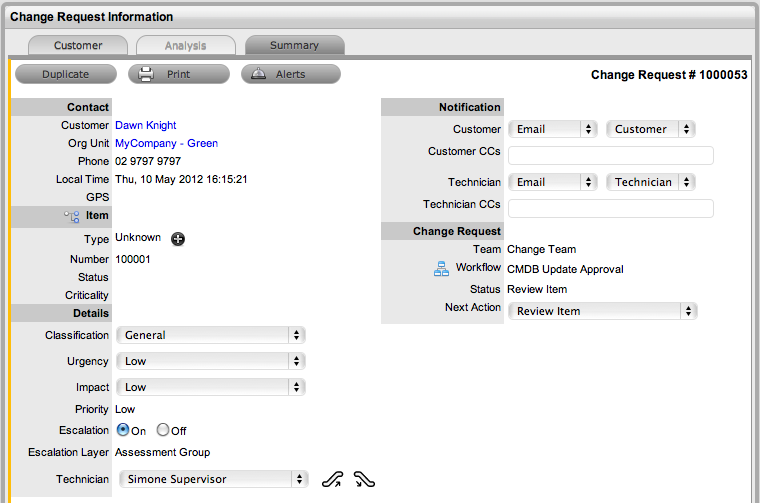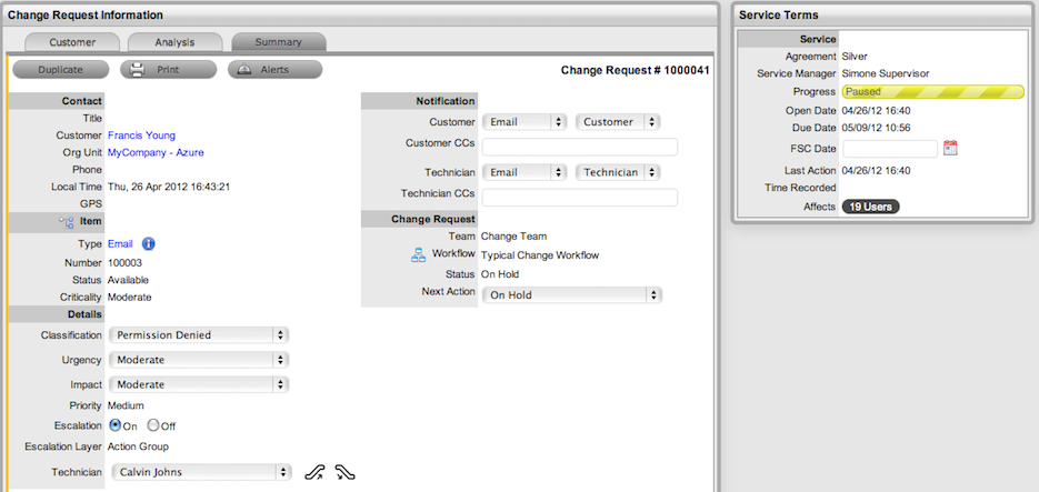 Associate the SLA to an Item or Customer or Org Unit. This final step ties all the elements together when a Change Request is created, as the SLA associated with the Item, Customer or Org Unit assigned to the Request determines the Workflow, Team and Technicians that are made available within the Service Request Information screen.