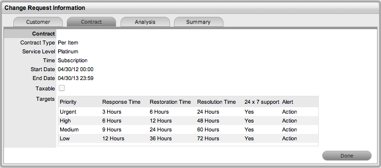 The Contract tab of a Request includes the details of the Contract Type and SLA assigned to the Request. If a valid contract is active for the Customer, Item or Organizational Unit assigned to the Request, then the details of the contract will be displayed. If an SLA is not assigned to the Customer, Item or Org Unit and the Billing functionality is not enabled, the system automatically applies a default SLA based on the Item Type or the system default SLA.