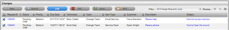 The default display is ten RFCs per batch. The list can be re-sorted by clicking on a column header and the number of RFCs displayed per batch can be altered using the Display pop-up option.