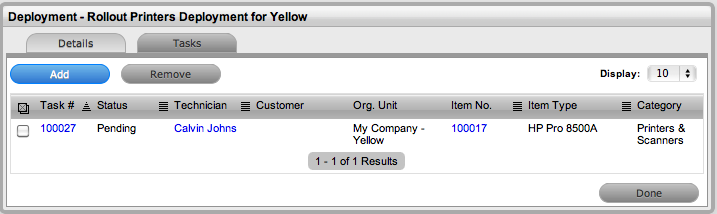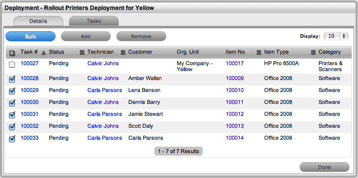 The Tasks tab lists all Deployment activities related to a Deployment. The User can add and remove Tasks within this tab, when the Deployment is not assigned a State that is configured as a Deployment Active State. They can also update the assigned Technician and Status, when the Tasks are in a Deployment Active State, of multiple Tasks by using the Bulk button.