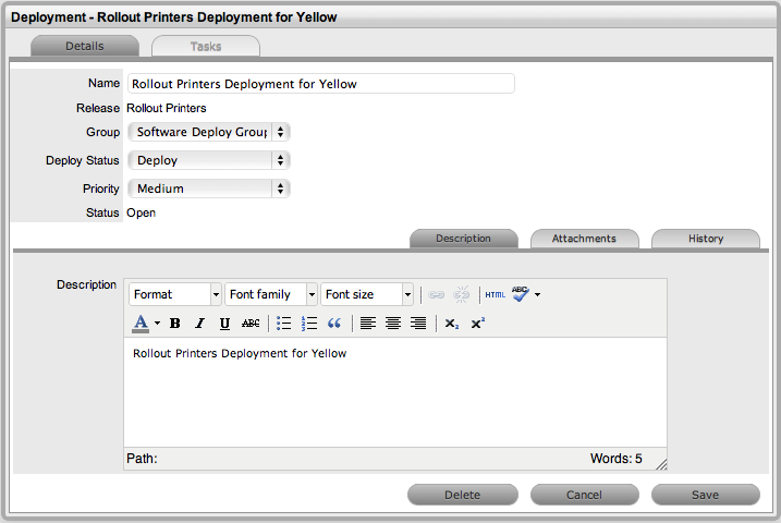 Click Save to record changes or Delete to remove the Deployment and erase all related Deployment Tasks.