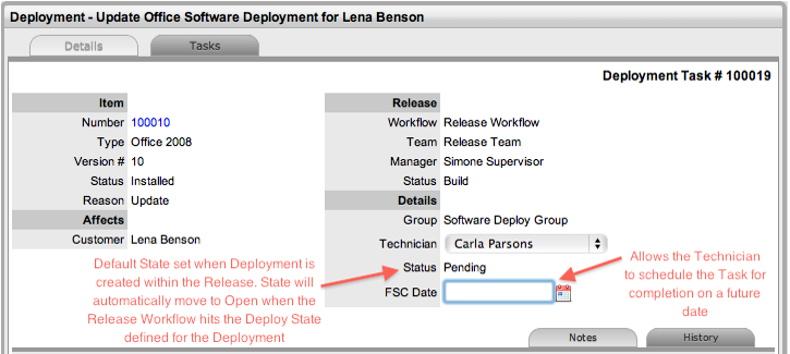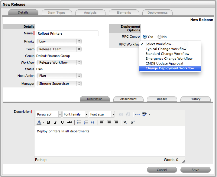 This Workflow includes the stages of Pending>Approval>Schedule Outage>On Hold>Deploy>Closed. When the RFC is assigned the Deploy State, the Deployment Tasks created in the Release, and now available in the Change>Deployment Tasks tab, will move automatically move from Pending to Open, and the assigned Technician can action the Task before moving the Deployment Task State to Closed - Resolved.