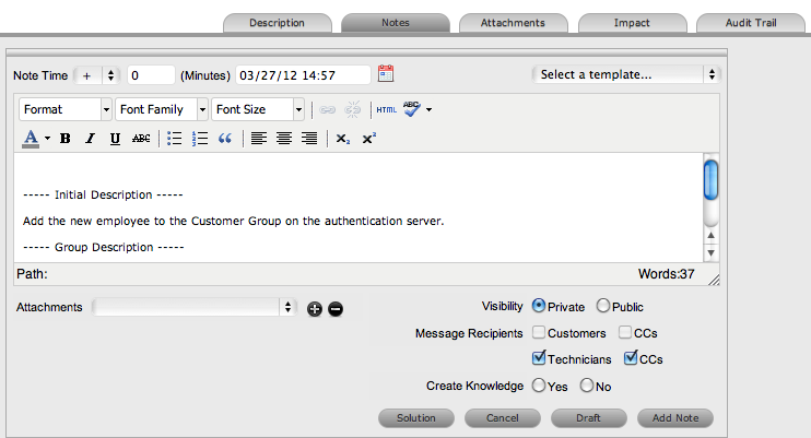 The time entered represents the amount of time accumulated to formulate the Note's content. If no additional time has been spent on the Task away from the application, leave this field blank, as the system calculates Logged Time when the request is in Edit mode. (See: Contracts Logged Time.)