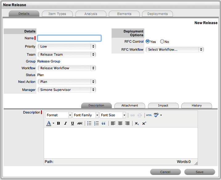 All Tasks are now saved with a Status of Pending assigned. When the Release Workflow moves to the Deploy State an RFC will be created. When the RFC hits the Release's RFC Control Deploy State the Tasks' Status will automatically be updated to Open, prompting Technicians to complete the Deployment Tasks and move the State to Closed-Resolved. When all Tasks are completed and moved to Closed - Resolved, the Release will be automatically Closed.