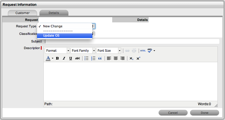 If the Item is to be assigned to the RFC using the Quick Call Template configuration, the User simply selects the Next button after assigning the Customer information to the RFC. The application moves to the Details tab and within the Request Type options, the list displayed only includes Templates that have Items preset.