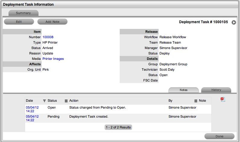 The Notes tab allows Users to create Notes for updates regarding a Deployment Task. To view any Notes listed within the Notes Tab, click on the Note Number hyperlink.