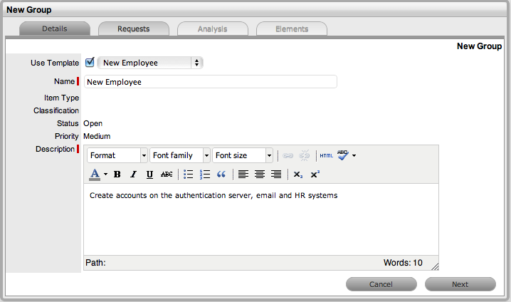 NOTE:The Next button will only be visible after the Customer has been assigned to the RFC, if Quick Call templates that have Items assigned are configured in the system.