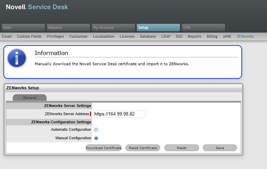 Provide Novell Service Desk Server address in the ZENworks Control Center for automatic exchange of certificates.