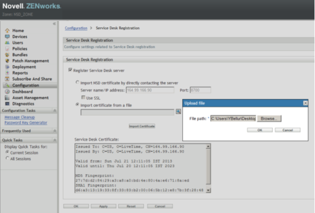 Click the browse button, and upload the Novell Service Desk certificate downloaded in Step 4. Click Apply. Click OK.