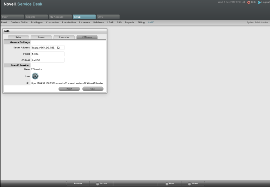 In the Novell Service Desk user interface, click Setup > AMIE > ZENworks.
