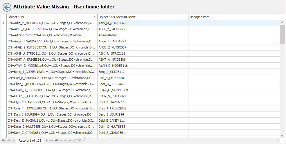 A sample Attribute Value Missing anomaly report is shown below. The Object FDN and Object SAM Account Name columns display the respective attributes. The Managed Path column does not have a value because this object is not yet managed by Novell Storage Manager. These objects are reported because they do not have homeDirectory attribute values. This report can be used to identify objects that should be managed. It can also identify objects that have had their respective path attribute cleared accidentally or erroneously by an identity management system.