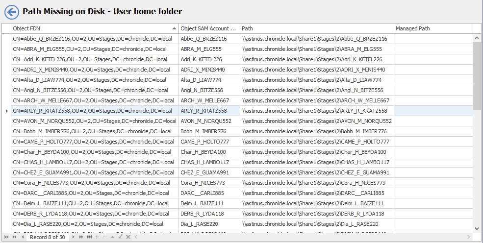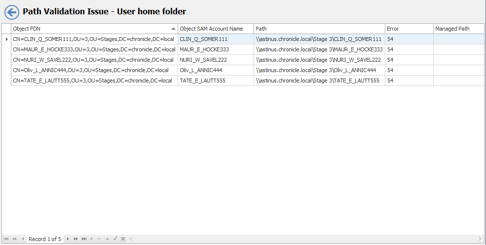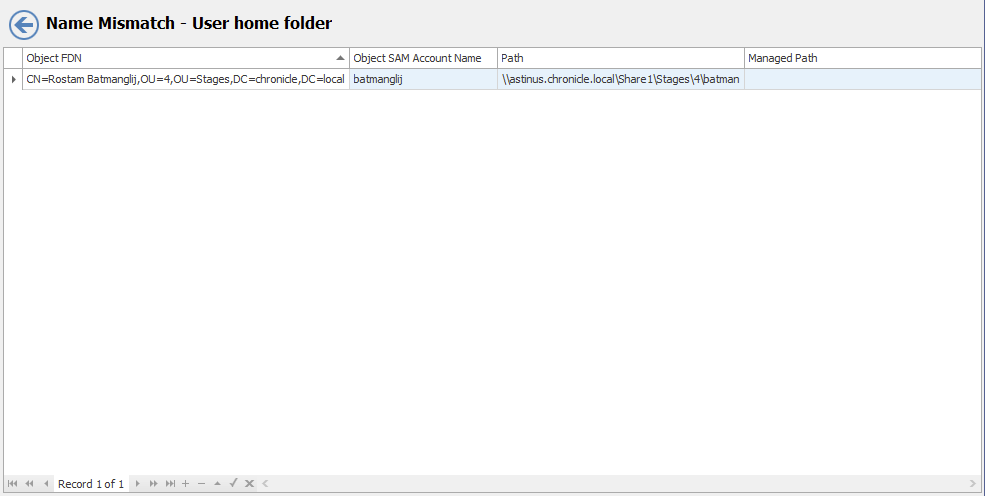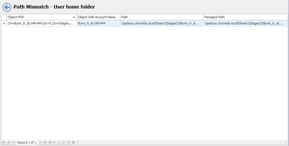 A sample Name Mismatch anomaly report is shown below. The Object FDN and Object SAM Account Name columns display the respective attributes. The Path column is the value of the homeDirectory attribute. The Path column contains the current respective path attribute value obtained from Active Directory. The Managed Path column contains the path value when the object was last managed. This object is reported because the leaf path name specified by its homeDirectory attribute does not match the sAMAccount name attribute. This report can be used to identify objects whose respective path might have been changed manually.