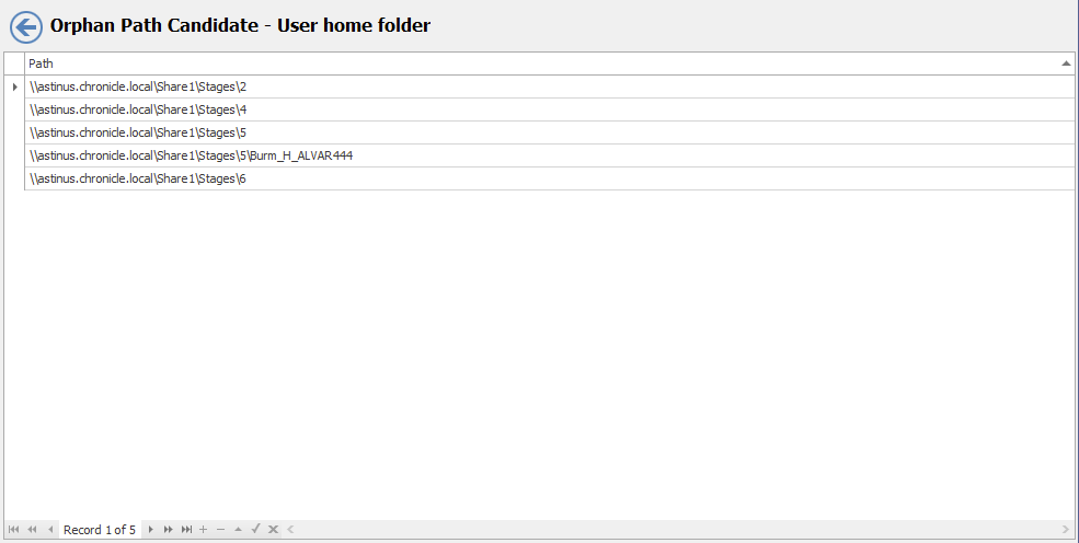 A sample Orphan Candidate anomaly report is shown below. The Path column is any path that is directly subordinate to a path at which other DS-associated paths have been found. However, the path is not associated with any object via a path attribute. This report can be used to identify folders that don’t belong to objects or are considered unmanaged.