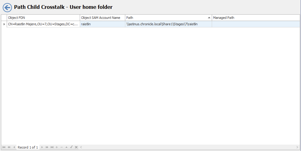 A sample Path Child Crosstalk anomaly report. The Object FDN and Object SAM Account Name columns display the respective attributes. The Path column is the value of the homeDirectory attribute. The Path column contains the current respective path attribute value obtained from Active Directory. The Managed Path column does not have a value because these objects are not yet managed by Novell Storage Manager. This object is reported because the value for its homeDirectory attribute has been detected as being the child of another object’s homeDirectory attribute. This report can be used to identify objects whose respective path attribute might be impacted by another object’s storage.