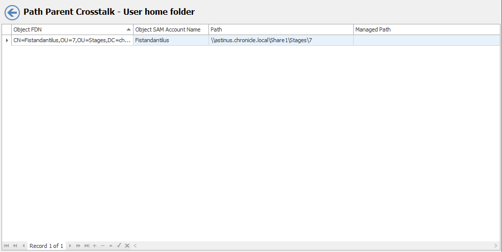 A sample Path Parent Crosstalk anomaly report is shown below. The Object FDN and Object SAM Account Name columns display the respective attributes. The Path column is the value of the homeDirectory attribute. The Path column contains the current respective path attribute value obtained from Active Directory. The Managed Path column does not have a value because these objects are not yet managed by Novell Storage Manager. This object is reported because the value for its homeDirectory attribute has been detected as being the parent of another object’s homeDirectory attribute. This report can be used to identify objects whose respective path attribute is set to the wrong location and might impact another object’s storage.