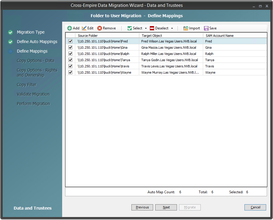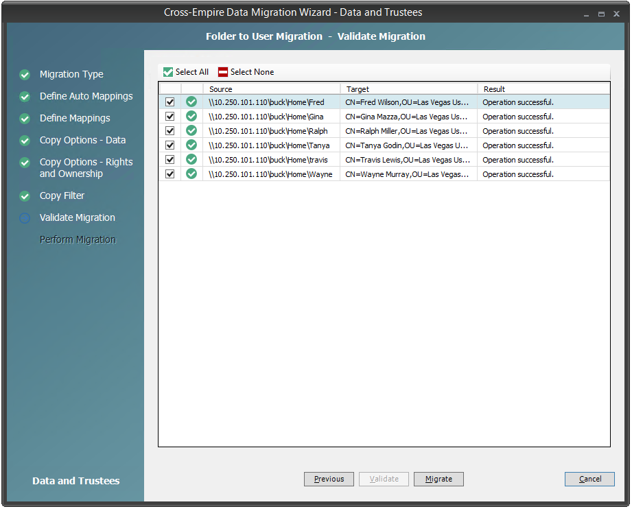 The Data Migration Wizard attempts to match the names of the subfolders of the source path with the SAM (Security Accounts Manager) Account Names in the Active Directory target. If there is a match, the listed folder in the Source Folder field is selected and a corresponding match is listed in the Target Object column.