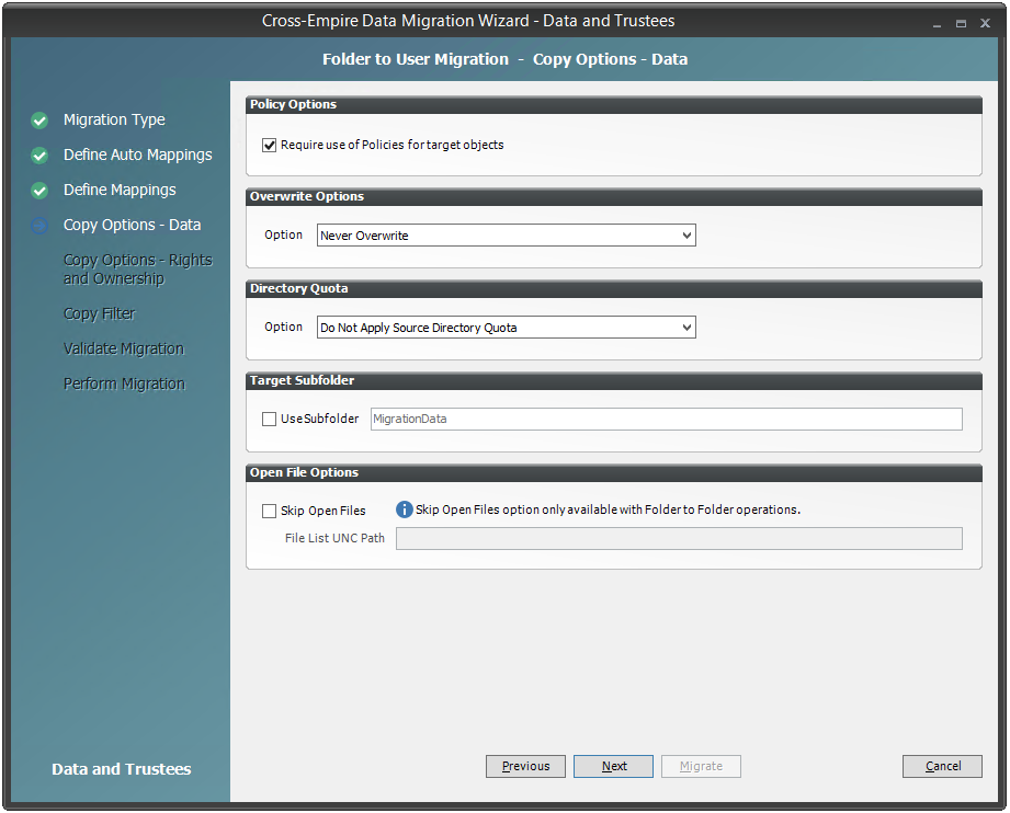 Target Subfolder: If you want migrated data to be placed in a subfolder, select the Use subfolder check box and specify the subfolder name in the field.