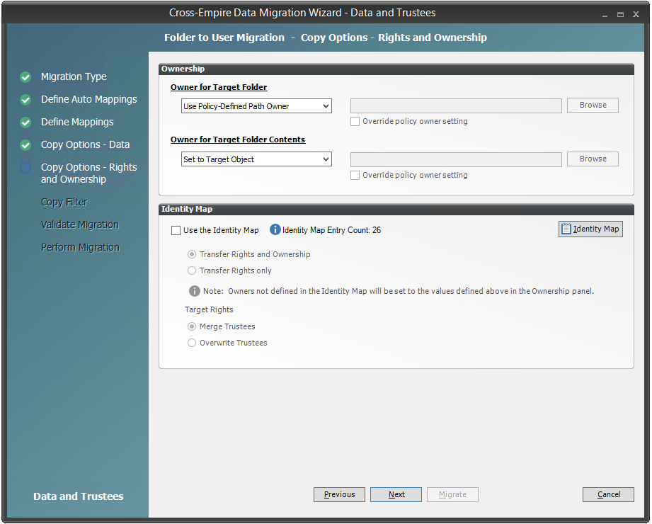 Use the Identity Map: Selecting this check box indicates that you want Novell Storage Manager to utilize the identity map you created earlier and use the corresponding IDs to copy security rights and file ownership from the Novell network file system to the Windows network file system.