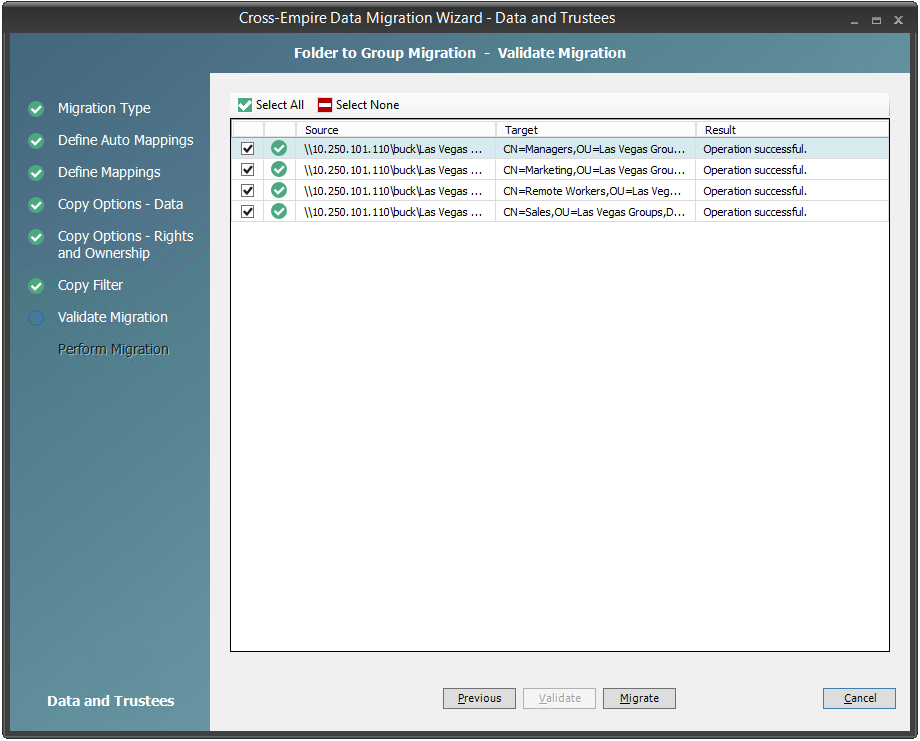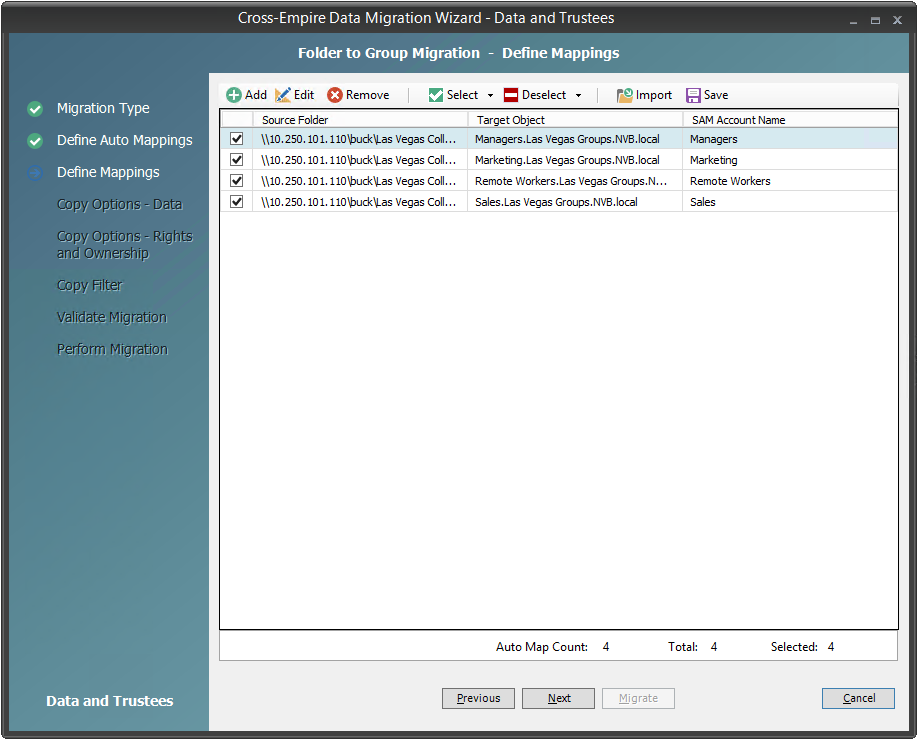 The Data Migration Wizard attempts to match the names of subfolders of the source path with the SAM (Security Accounts Manager) Account Names of groups in the Active Directory target. If there is a match, the listed folder in the Source Folder field is selected and a corresponding match is listed in the Target Object column.