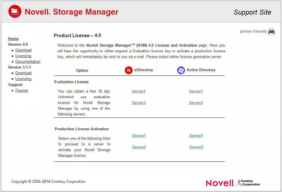 A new Web page appears with options for obtaining the license in either eDirectory or Active Directory managed network environments.