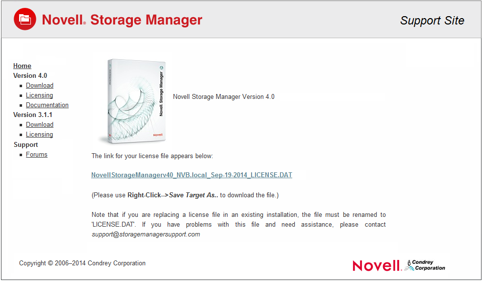 Novell Storage Manager requires a production license file or evaluation license file that you obtain from Novell.