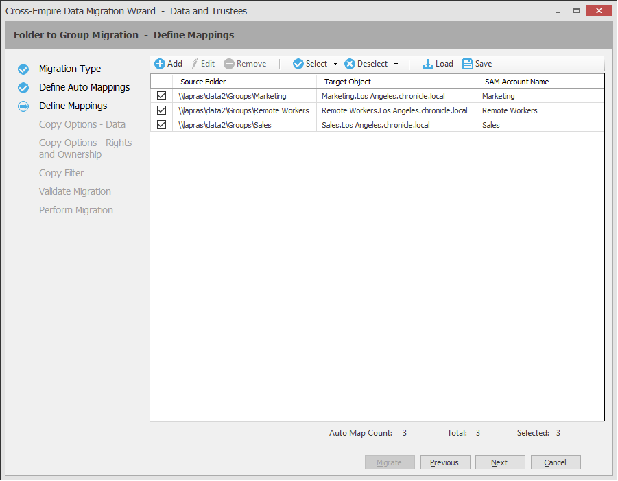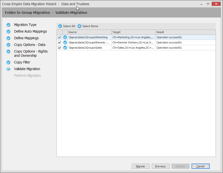 The Data Migration Wizard attempts to match the names of subfolders of the source path with the SAM (Security Accounts Manager) Account Names in the Active Directory target. If there is a match, the listed folder in the Source Folder field is selected and a corresponding match is listed in the Target Object column.