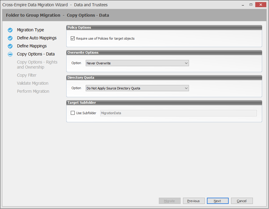 Target Subfolder: If you want migrated data to be placed in a subfolder, select the Use subfolder check box and specify the subfolder name in the field.
