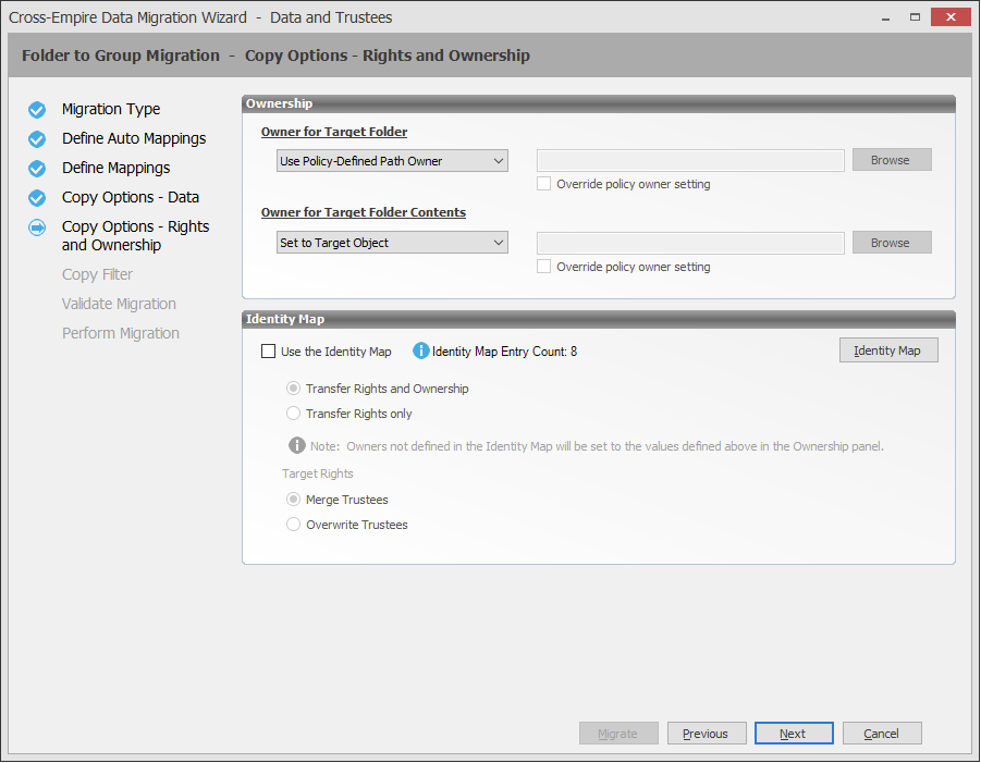 Use the Identity Map: Selecting this check box indicates that you want Storage Manager to utilize the identity map you created earlier and use the corresponding IDs to copy security rights and file ownership from the Novell or Micro Focus network file system to the Windows network file system.