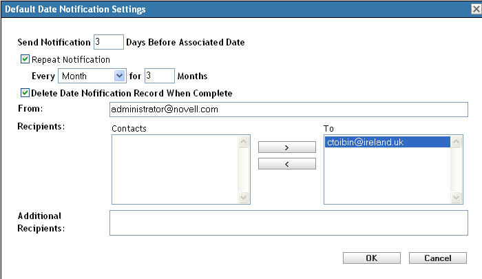 Additional Recipients: You must add at least one default recipient. To do so, you can use this field or the field. To use this field, specify at least one address (for example, pjones@novell.com). Separate addresses with commas.