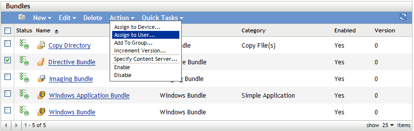 You can assign the bundle to individual devices, users, folders, or groups. Assigning a bundle to a folder or group is the preferred method of assigning bundles. This allows for easier management of the bundle assignments and can decrease the possibility of high server utilization caused by assigning the bundle to a large number of items (for example, more than 250).