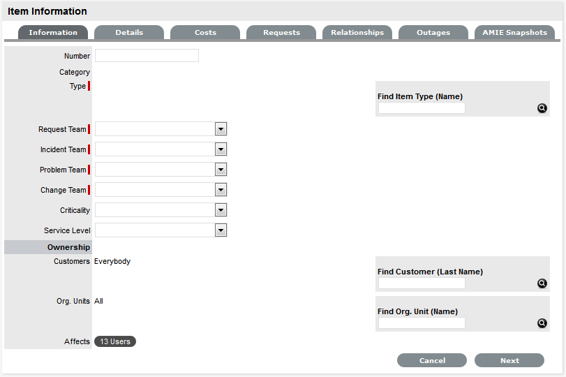 The Financial Costs and Inherited Costs fields allow the support organization to assign costs across related Items and charge Users and/or Organizational Units appropriately.