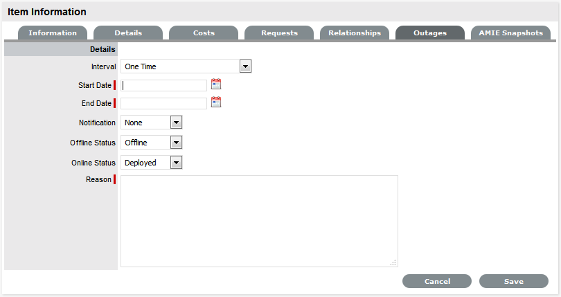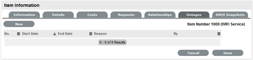 Planned outages can be created for an Item under the Outages tab. This is a period of time an Item will not be available for a Customer's use.