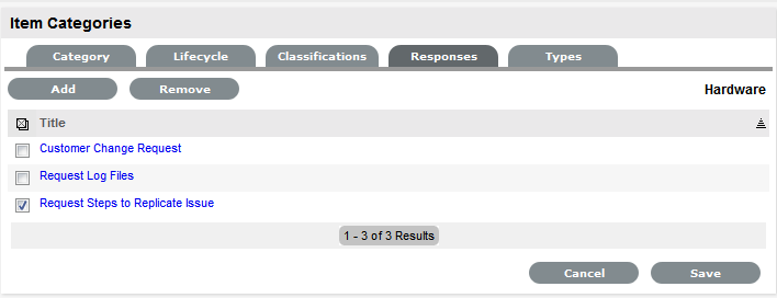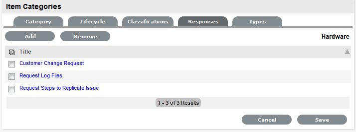 The Responses tab within an Item Category allows the Supervisor to define template replies for Notes sent related to requests received against the Item Category. This ensures the service desk responds to issues in a consistent manner, and in line with the support organization's policies and protocol. Additional templates can be configured within the Item Type>Responses tab. These templates are only available for requests related to the Item Type.