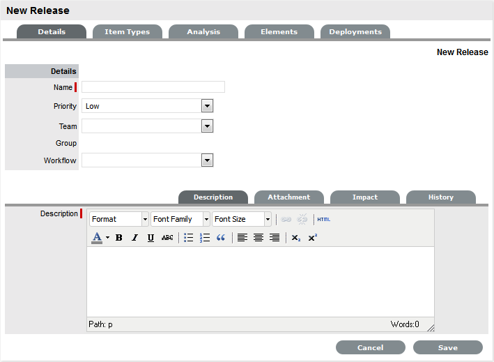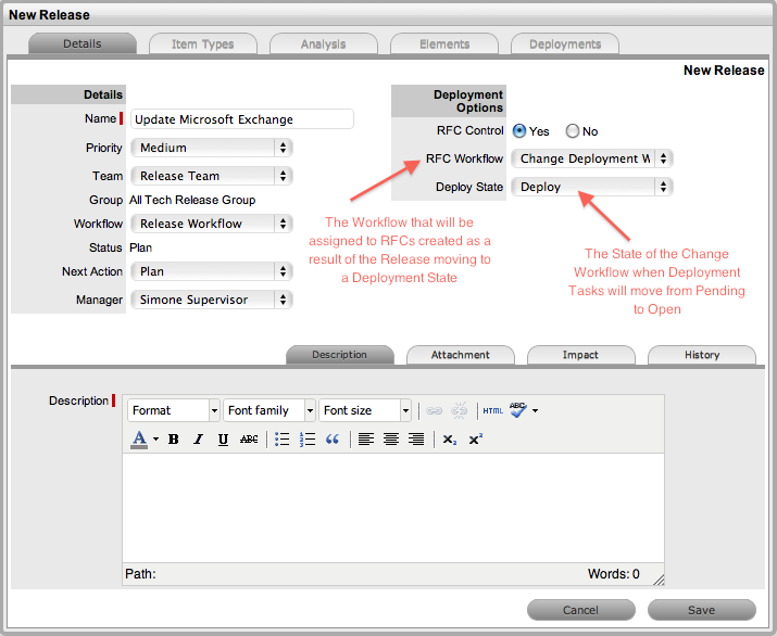 From the above screen snap, we can see that Simone Supervisor is the Release Manager assigned to the Release and that the Release is of low Priority, will be handled by the Release Team and managed using the Release Workflow. The Release is currently in the default entry point of the Release, the Plan State. It should be noted that moving through the Release Workflow is determined by your organization's business processes and the defined Workflow. The system is to be used as a central repository to manage Releases and a point of reference to keep all relevant parties updated regarding a Release.