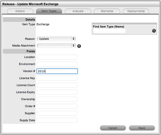 If an electronic upgrade file is to be used for the upgrade, it can be uploaded within the Media Attachment field. This would then be made available within the Deployment Task associated with the Release.