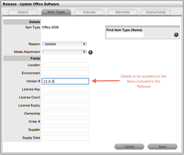 To associate the Items that are to be created or updated as part of the Release, the Release Manager has to define the reason for the Release and assign the relevant Item Type to the Release. This is achieved within the Item Types tab of the Release. For our example, there will be three reasons for the Release:- Upgrade existing software, replacing existing software and installing new software.