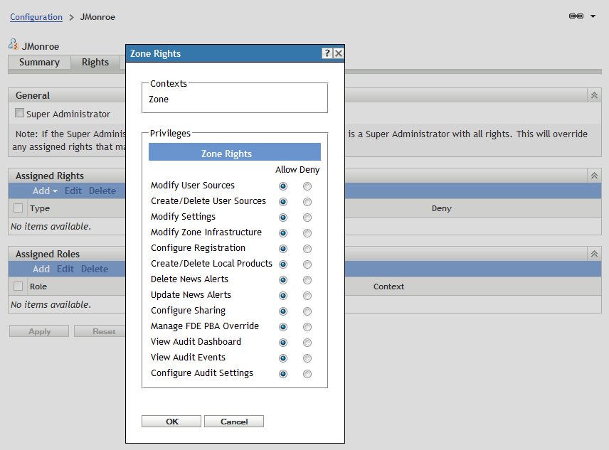 In the Assigned Rights panel, click > to display the Zone Rights dialog box.