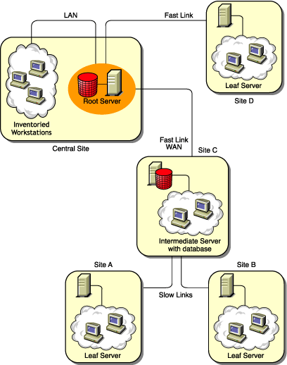 In this scenario, the network consists of many remote sites connected to a Central Site over WAN. Each remote site has a Leaf Server that collects inventory information from workstations located in the same site, and rolls up the inventory information to the Root Server located at the central site. The remote sites are administered from the Central Site because the Leaf Servers do have Inventory database attached to it.