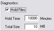 To capture reports in the diagnostics package, select the box in the Reporting window. This option causes reports to be retained in the temp directory for the time/space defined in the Reporting window. These reports can then be bundled in the diagnostics package.