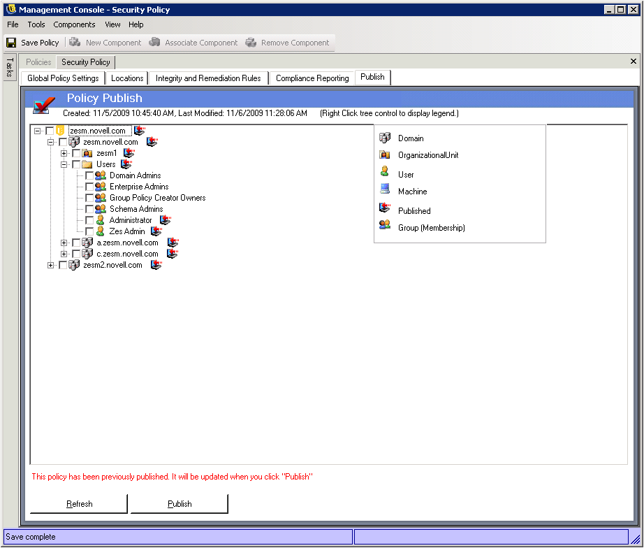 The Policy Publish page displays the directory service trees to which the system has connections. The