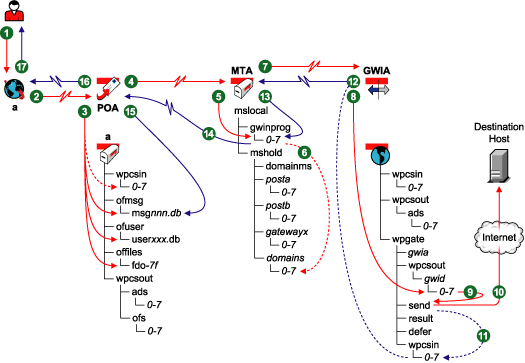 The POA then communicates the message to the MTA for the sender’s domain by way of TCP/IP, and deletes the copy in the MTA input queue because the TCP/IP transfer to the MTA was successful. |