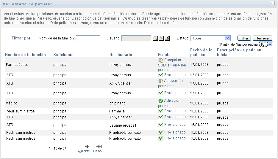 NOTA:Si el reloj del sistema del servidor en el que se encuentra el controlador del servicio de funciones no está sincronizado con el reloj del sistema del servidor en el que se ejecuta la aplicación de usuario, el estado de la petición puede mostrarse de forma diferente en las páginas Ver estado de petición y Asignaciones de funciones. Por ejemplo, si ha solicitado una asignación de función que no requiere aprobación, puede ver el estado como Provisionado en la página Ver estado de petición, y como Activación pendiente en la página Asignaciones de funciones. Si espera aproximadamente un minuto, verá como el estado de la página Asignaciones de funciones cambia a Provisionado. Para asegurarse de que el estado se muestra correctamente en todos los componentes de la aplicación de usuario, compruebe los relojes del sistema para asegurarse de que estén sincronizados de forma adecuada.