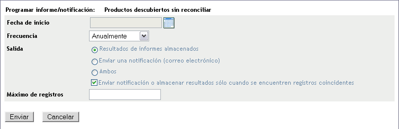 Salida: seleccione lo que quiere que suceda cuando el informe se genere. Puede simplemente almacenar el informe, enviar una notificación por correo electrónico indicando que el informe está listo o ambas cosas. También puede indicar que se almacenen los resultados o que se envíe una notificación sólo cuando el informe incluya datos.