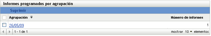 La página Informes programados por agrupación se abre y muestra los informes agrupados por fecha o título, así como un recuento de informes.
